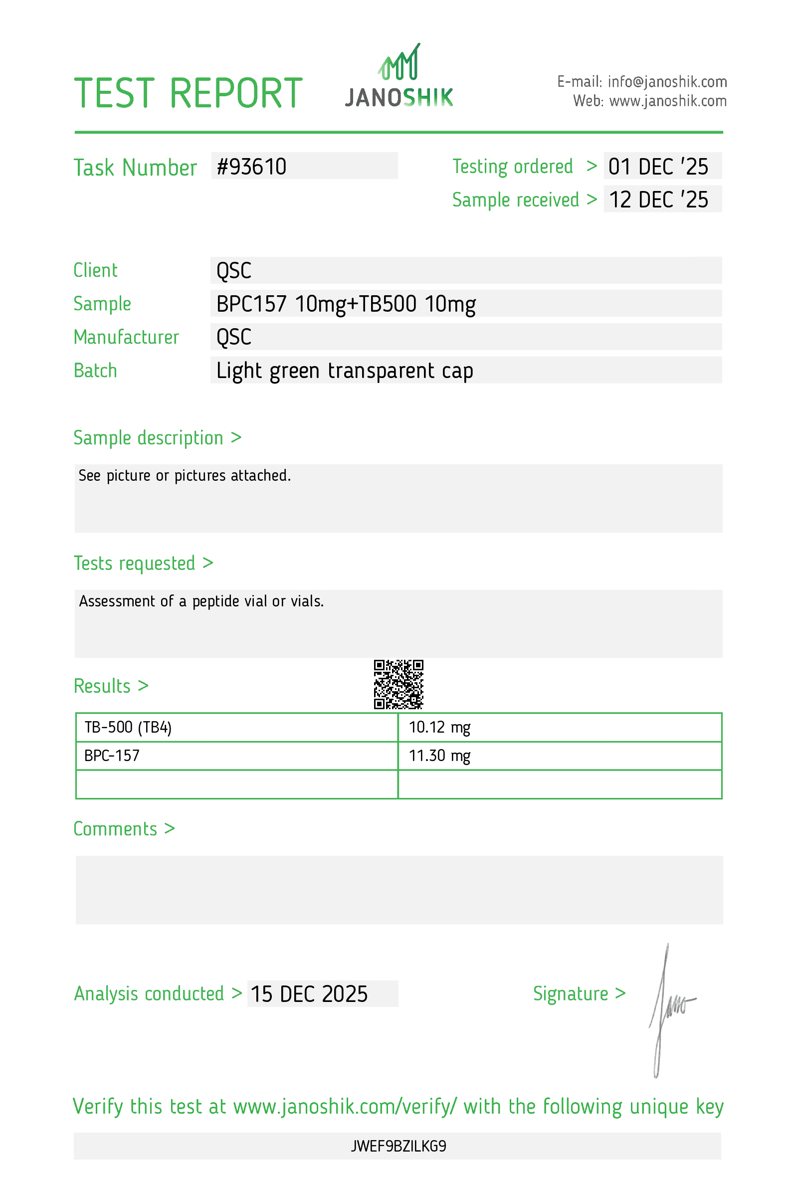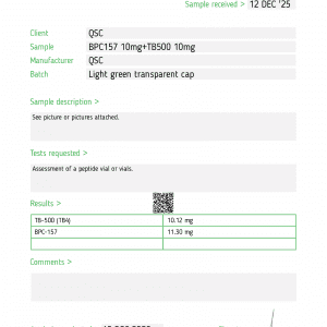 | Form | Pre-blended equimolar BPC-157 + TB-500 per vial |