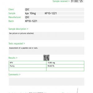 QSC KPV (Alpha-MSH(11-13) C-terminal tripeptide) — ≥99% HPLC purity, MS confirmed, Janoshik COA. Research use only.