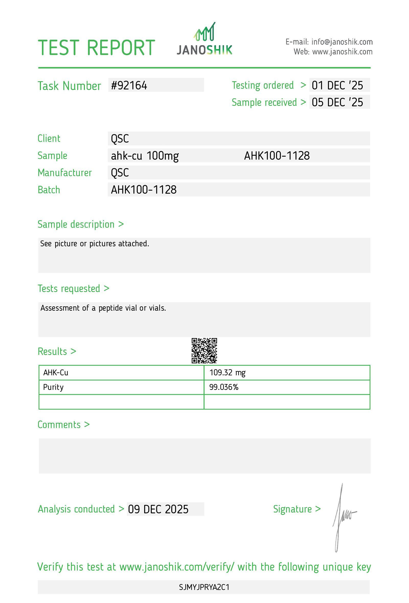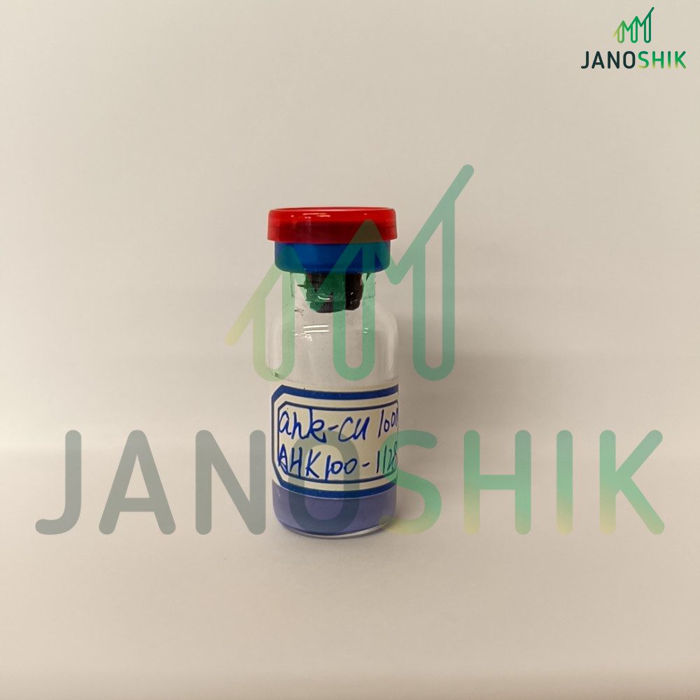 AHK-Cu (Alanine-Histidine-Lysine copper(II) — GHK-Cu structural homolog) is a Copper-binding tripeptide (Ala-His-Lys·Cu²⁺). Copper-binding tripeptide structurally analogous to GHK-Cu with Ala substituting Gly at the N-terminus. Activates fibroblast collagen synthesis, inhibits MMP activity, and has angiogenic properties via copper-mediated mechanisms — different tissue distribution and receptor affinity profile from GHK-Cu.