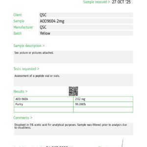 QSC AOD-9604 (Modified HGH Fragment 177-191) — ≥99% HPLC purity, MS confirmed, Janoshik COA. Research use only.