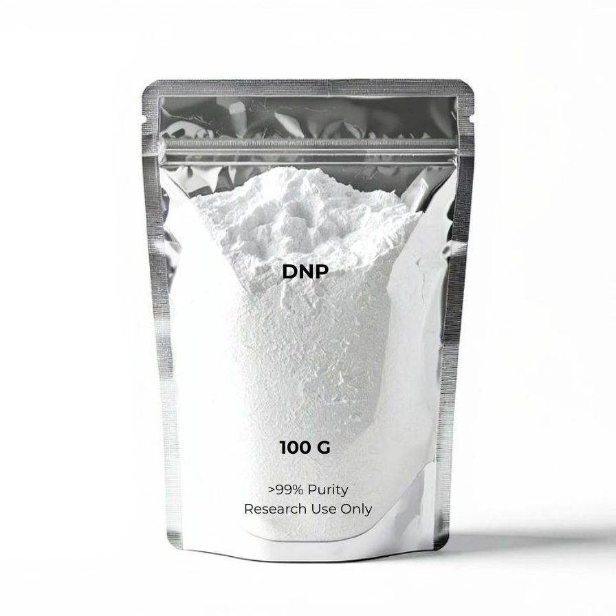DNP (2,4-Dinitrophenol — mitochondrial proton uncoupler) is a Small molecule C₆H₄N₂O₅, MW 184.1. Lipophilic proton carrier crossing the inner mitochondrial membrane and dissipating the H⁺ gradient — uncoupling oxidative phosphorylation from ATP synthesis. Energy released as heat (thermogenesis) proportional to dose. Increases metabolic rate dramatically. Extremely narrow therapeutic margin — lethal in overdose. Research use only.
