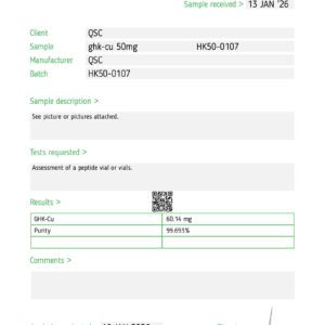 QSC GHK-Cu (Glycyl-L-histidyl-L-lysine copper(II)) — ≥99% HPLC purity, MS confirmed, Janoshik COA. Research use only.